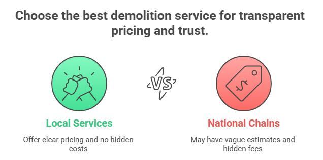 When it comes to demolition, money matters just as much as time. One of the biggest worries for many people is getting hit with surprise costs they didn’t plan for. That’s where local services often stand out.